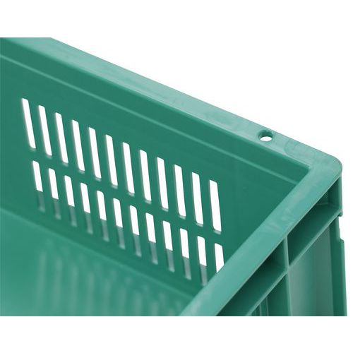 Velmi robustní stohovací plastové boxy v zeleném provedení. Perforované stěny a dno boxu. Vysoká stabilita stohování díky zesíleným okrajům.