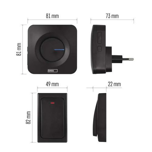 - Rozměry zvonku 73 x 73 x 81 mm, rozměry tlačítka 22 x 49 x 82 mm.