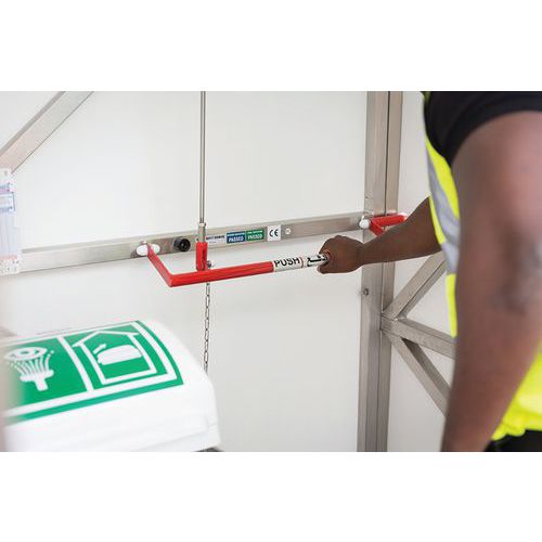 - Aktivace sprchy pomocí panikové lišty, aktivace oční sprchy pomocí nožního pedálu.