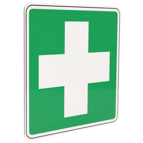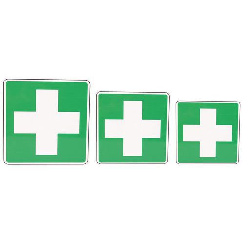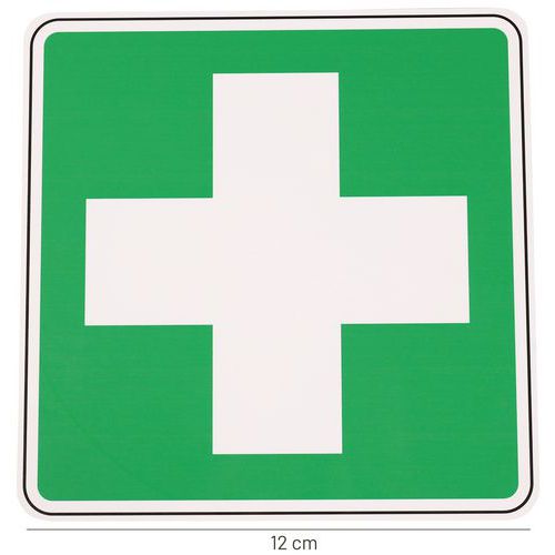 - Bezpečnostní značky se symbolem první pomoci, které vám umožní rychle najít potřebné nouzové vybavení.