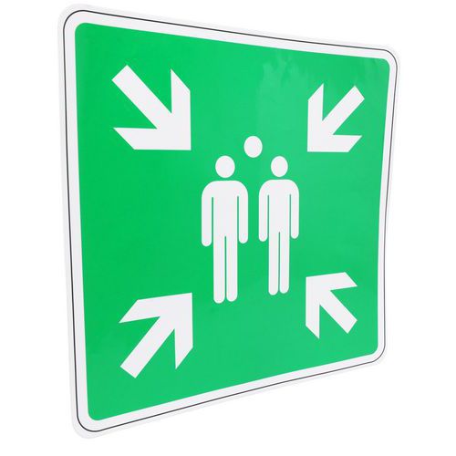 - Bezpečnostní únikové tabulky, které označují místo ke shromáždění osob během evakuace.
