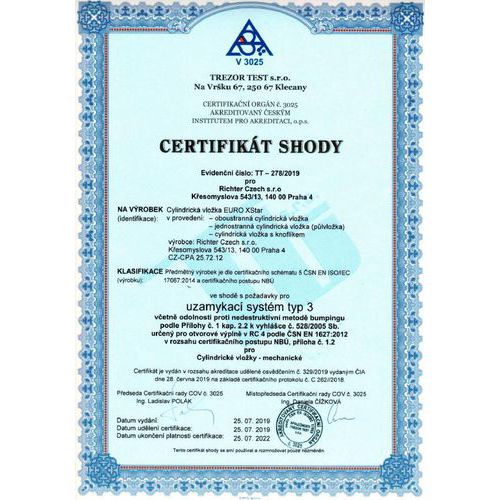- Vysoká ochrana proti odvrtání pomocí 9prvků z kalené oceli, 5 kolíků, 1 stavítko a 3 kuličky.