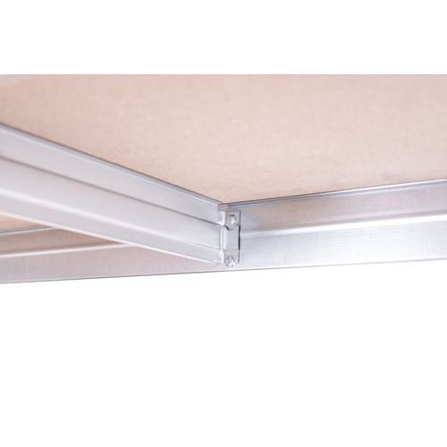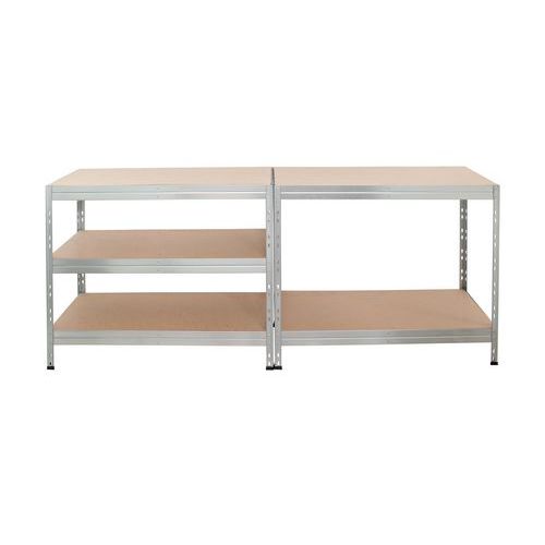 - Stojiny se skládají ze dvou částí a regál tak lze přestavět na dílenský stůl.