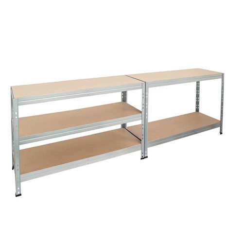 - Stojiny se skládají ze dvou částí a regál tak lze přestavět na dílenský stůl.