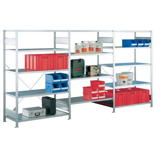 - Regály s pozinkovaným povrchem mají jednoduchou montáž a lze je dle potřeby dále rozšířit o další police, popřípadě o přístavný regál.