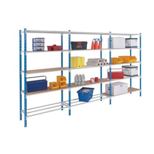 Bezšroubové kovové regály Velez s pěti výškově nastavitelnými policemi. Vhodný pro ukládání zboží v průmyslových provozech, skladech, dílnách atd. Počet trubkových profilů je dán hloubkou police (400 mm - 3 ks, 500 mm - 4 ks, 600 mm - 800 mm - 5 ks). Regály s komaxitovou úpravou práškovou barvou mají jednoduchou montáž a lze je dle potřeby dále rozšířit o další police, popřípadě o přístavný regál. Dřevotřískové desky nejsou součástí dodávky a je nutné je objednat zvlášť.