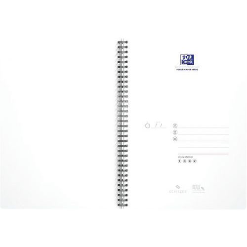 Hladký bílý papír pro větší pohodlí při psaní. Oboustranný kryt z hladkého neprůhledného polypropylenu. Obal je odolný proti poškrábání, postříkání a roztržení. Čtverečkované stránky 5 mm mají záhlaví pro zobrazení názvu a data, aby bylo možné snadno identifikovat obsah, a také dvojitý okraj vlevo pro poznámky. Odolná vazba se dvěma drátky, která umožňuje úplné otevření notebooku pro maximální flexibilitu a pohodlí při používání. Jedinečný, mimořádně hladký papír navržený společností OXFORD, který nepropouští inkoust.