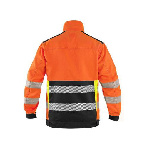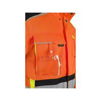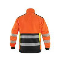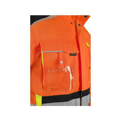 Pánská výstražná blůza, ramena zesílena materiálem CORDURA, rukávy s nastavitelnou manžetou na suchý zip, kryté zapínání na zip, suché zipy a druky, levá náprsní kapsa na zip, pravá krytá klopou, v pravé kapse odnímatelné pouzdro na ID kartu, na levém rukávu kapsička na tužky, boční kapsy na zip, segmentované reflexní pásky (šíře 5 cm), kontrastní žluté/oranžové a reflexní doplňky. Doporučené použití: stavebnictví, silničáři, údržba, logistika, letecká a lodní doprava. Velikost: 48-60 Svrchní materiál: Základní materiál: satén 60 % bavlna 40 % polyester, Doplňkový materiál: kepr 60 % bavlna 40 % polyester Reflexní doplňky: Ano OEKO-TEX® STANDARD 100: Ano