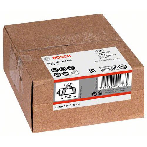 Karborundový brusný hrnec s pojivem ze syntetické pryskyřice. Hodí se pro obouruční úhlové brusky, maximální otáčky až 8 500 min-1. Upínání upínací maticí 1 603 340 040 a lomeným klíčem s dvěma čepy 1 607 950 004