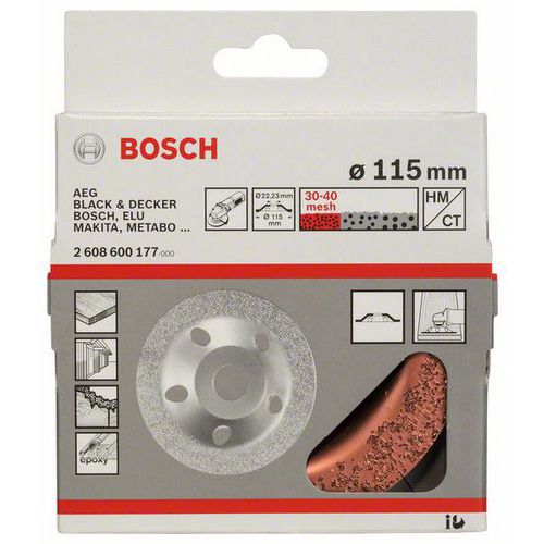 Hrncové kotouče s tvrdokovovým posypem pro mnohostranné možnosti použití. Hodí se pro odstraňování přesahů z bednění na pohledovém betonu, zbytkového betonu na prknech bednění, zbytků lepidla na dlaždicích, zbytků sklolaminátu nebo silných vrstev barev, opracování vápencového pískovce, zaoblování mramoru, čištění malých ploch od ochranných nátěrů, úpravu plynobetonu, péči o paznehty u kopytníků. Různá zrnitost - hrubá, střední, jemná - pro optimalizaci práce. Všechny hrncové kotouče z tvrdokovu Bosch jsou samostatně vyvážené. Hodí se pro opracování sklolaminátů, plynobetonu, měkkého a tvrdého dřeva, barev, laků, plniv, gumy, korku, kůže, plastů, pískovce, vápencového pískovce. Pro ručně vedené úhlové brusky při maximální obvodové rychlosti: 80 m/s (závisí na otáčkách a průměru kotouče). Upozornění: Bezprašná práce díky odsávacímu krytu Bosch 2 605 510 107, který připevníte bez použití nástrojů