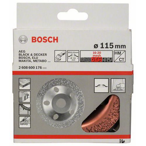Hrncové kotouče s tvrdokovovým posypem pro mnohostranné možnosti použití. Hodí se pro odstraňování přesahů z bednění na pohledovém betonu, zbytkového betonu na prknech bednění, zbytků lepidla na dlaždicích, zbytků sklolaminátu nebo silných vrstev barev, opracování vápencového pískovce, zaoblování mramoru, čištění malých ploch od ochranných nátěrů, úpravu plynobetonu, péči o paznehty u kopytníků. Různá zrnitost - hrubá, střední, jemná - pro optimalizaci práce. Všechny hrncové kotouče z tvrdokovu Bosch jsou samostatně vyvážené. Hodí se pro opracování sklolaminátů, plynobetonu, měkkého a tvrdého dřeva, barev, laků, plniv, gumy, korku, kůže, plastů, pískovce, vápencového pískovce. Pro ručně vedené úhlové brusky při maximální obvodové rychlosti: 80 m/s (závisí na otáčkách a průměru kotouče). Upozornění: Bezprašná práce díky odsávacímu krytu Bosch 2 605 510 107, který připevníte bez použití nástrojů