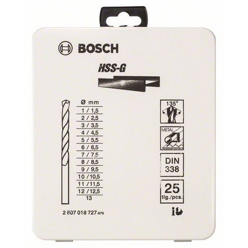 | Název produktu | Bosch - Kovová kazeta s 25dílnou sadou vrtáků do kovu HSS-G, DIN 338, 135° 1-13 mm, 135°, 25ks |