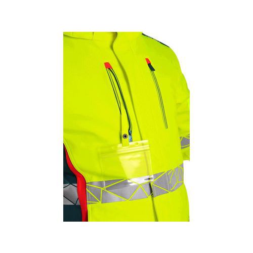 Pánská výstražná zateplená bunda s odepínací kapucí, odolná proti vodě a větru. Fleecový límec, větrání v podpaží, regulovatelné manžety na rukávech, vnitřní manžety v rukávech, kryté zapínání na zip a druky, náprsní a boční kapsy na zip, v pravé náprsní kapse dnímatelné pouzdro na ID kartu, segmentované reflexní pásky, kontrastní HV červené a petrolejové doplňky, vnitřní náprsní kapsy, stahování v dolním okraji, TPU membrána, odolnost materiálu proti průniku vody 8000 mm mimo oblast švů, paropropustnost 5000 g/m2/24h. Doporučené použití: stavebnictví, silničáři, řidiči, letecká a lodní doprava, logistika, řidiči kamionů, policie. Velikost: 2XL-XL Sezóna: Zimní Svrchní materiál: 100 % polyester Voděodolnost: 8 000 mm Paropropustnost: 5 000 g/m2/24hod TPU membrána: ANO Zateplení: 100 % polyester, 100 g/m2 Reflexní doplňky: Ano