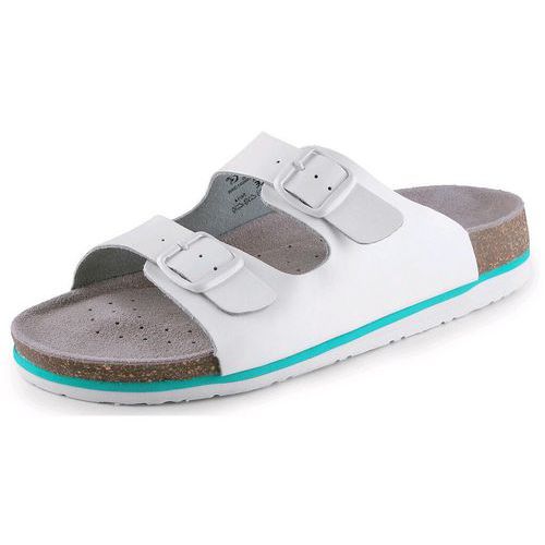 Dámské bílé zdravotní korkové nazouváky s anatomicky tvarovanou stélkou. Se dvěma nastavitelnými nártními pásky a rovnou podešví. velikost: 35 - 41 provedení: dámské materiál: svršek i stélka z hovězí semišové kůže, podešev EVA barva: bílá certifikace: EN ISO 20347 anatomicky tvarovaná stélka EN ISO 20347: Tato mezinárodní norma stanovuje základní a dodatečné (nepovinné) požadavky na pracovní obuv, která není vystavena mechanickým rizikům (nárazu nebo stlačení).