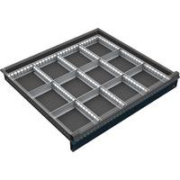 Dělení zásuvky je tvořeno sestavou kovových přepážek, které umožňují rozdělení zásuvek až na 12 přihrádek. Vhodné do zásuvek s výškou čela 6-12 cm a šíří skříně 72 cm.
