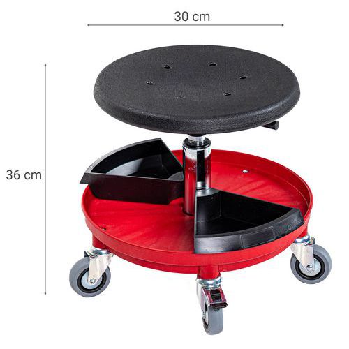 Mobilní montážní židle pro práci. Veškeré nářadí máte vždy po ruce ve dvou přihrádkách na nářadí. Snadno nastavíte výšku sezení. S 5 kolečky, z toho 2 s brzdou. Nastavení výšky sedací plochy Záruka výrobce pro zákazníka : 3 roky