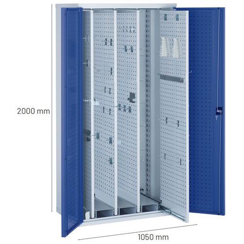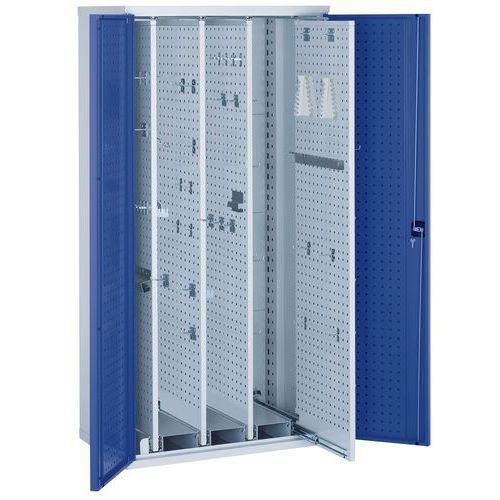 - Dílenské skříně se čtyřmi výsuvnými oboustrannými perforovanými panely s plnovýsuvy pro flexibilní zavěšení nářadí.