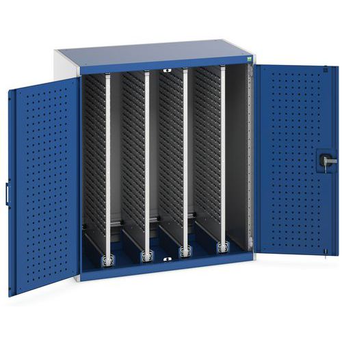 - Dílenské skříně se čtyřmi výsuvnými oboustrannými perforovanými panely s plnovýsuvy pro flexibilní zavěšení nářadí.