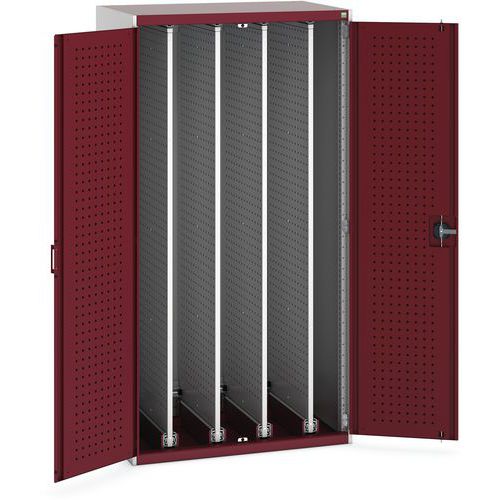 Dílenská skříň Bott Cubio s výsuvnými perfopanely, 200 x 105 x 65 cm, plné dveře, šedá-červená