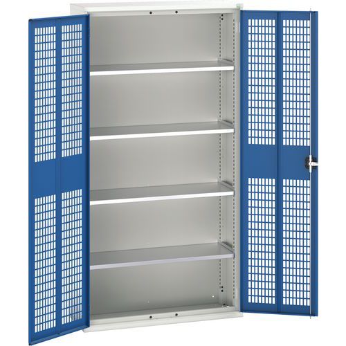 Dílenská skříň policová Bott Verso, drátěné dveře, 4 police, 200 x 105 x 35 cm, šedá-modrá
