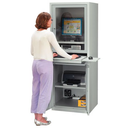 Chraňte svůj počítač v pevné uzamykatelné počítačové skříni. Pracujte v dobrých podmínkách a umístěte klávesnici na výsuvnou polici. Poličku na myš lze umístit na pravou nebo levou stranu. Celá skříň je uzamykatelná jedním klíčem. Dodávána včetně ventilátoru 9 W a napájecí lišty s pěti zásuvkami. Max. zatížení (kg) : 300 kg Max. zatížení police (kg) : 50 kg