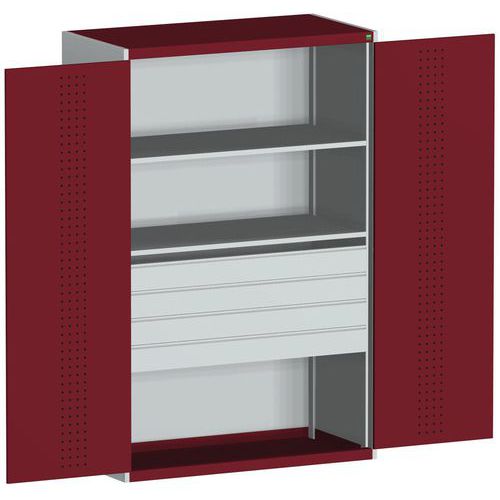 Dílenská skříň se zásuvkami Bott Cubio 160, 200 x 130 x 65 cm, 2 police, 4 zásuvky, šedá-červená