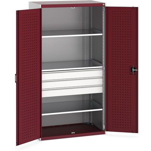 Dílenská skříň se zásuvkami Bott Cubio, 200 x 105 x 65 cm, 3 police, 3 zásuvky, šedá-červená