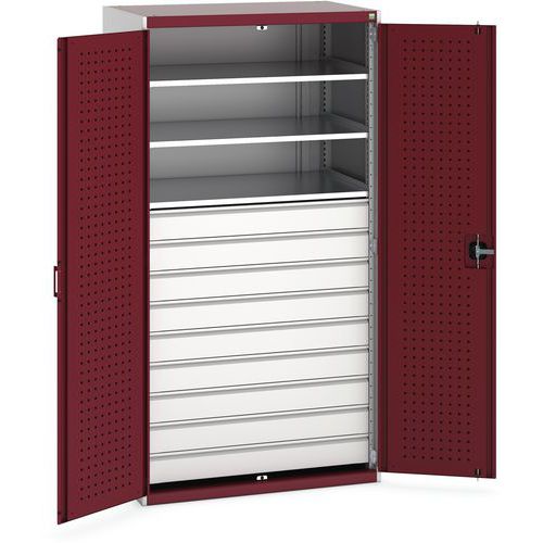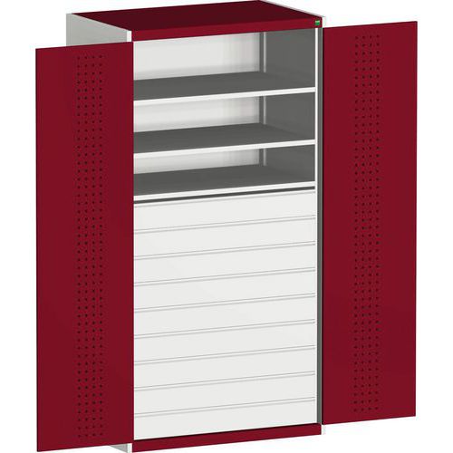 Dílenská skříň se zásuvkami Bott Cubio, 200 x 105 x 65 cm, 3 police, 9 zásuvek, šedá-červená