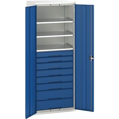 Dílenská skříň se zásuvkami Bott Verso, 200 x 80 x 55 cm, 3 police, 8 zásuvky, šedá-modrá