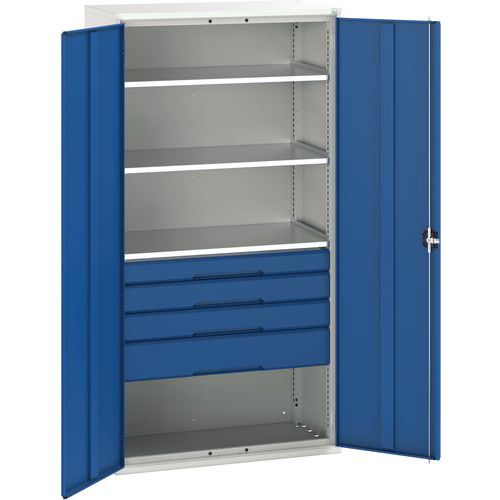 Dílenská skříň se zásuvkami Bott Verso, 200 x 105 x 55 cm, 3 police, 4 zásuvky, šedá-modrá