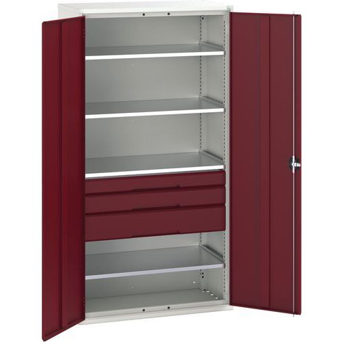 Dílenská skříň se zásuvkami Bott Verso, 200 x 105 x 55 cm, 4 police, 3 zásuvky, šedá-červená