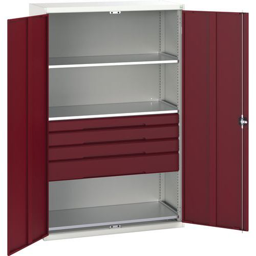 Dílenská skříň se zásuvkami Bott Verso, 200 x 130 x 55 cm, 3 police, 4 zásuvky, šedá-červená