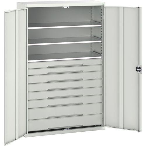 Dílenská skříň se zásuvkami Bott Verso, 200 x 130 x 55 cm, 3 police, 8 zásuvky, šedá-šedá