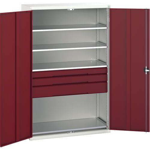 Dílenská skříň se zásuvkami Bott Verso, 200 x 130 x 55 cm, 4 police, 3 zásuvky, šedá-červená