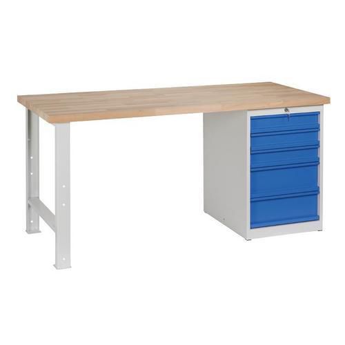 Dílenský stůl Weld ve dvou barevných variantách složený z pracovní desky, pevného podnoží a kontejneru s pěti zásuvkami.
