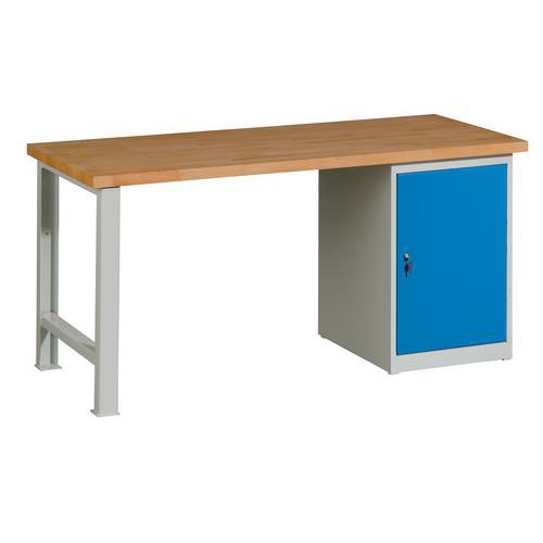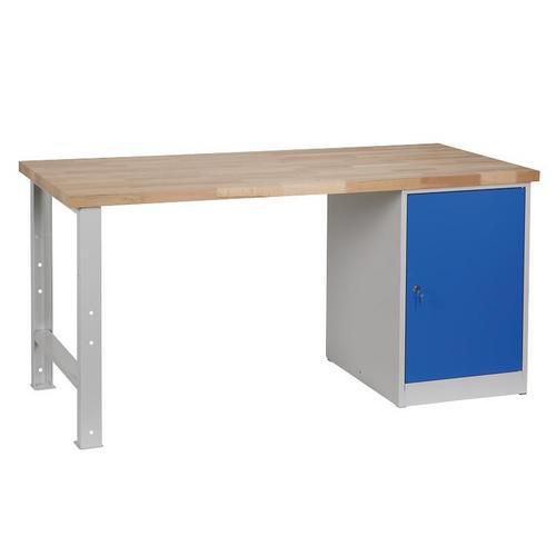Dílenský stůl Weld ve dvou barevných variantách složený z pracovní desky, pevného podnoží a skříňky.