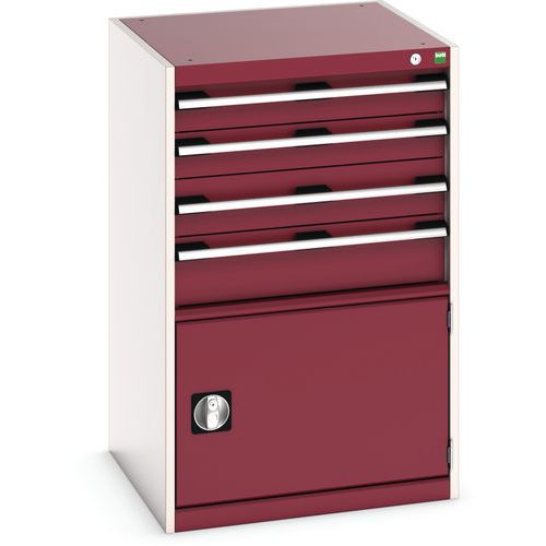 Dílenská zásuvková skříň Bott Cubio, 100 x 65 x 65 cm, 4 zásuvky, 1 skříňka, šedá-červená