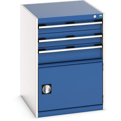 Dílenská zásuvková skříň Bott Cubio, 90 x 65 x 75 cm, 3 zásuvky, 1 skříňka, šedá-modrá