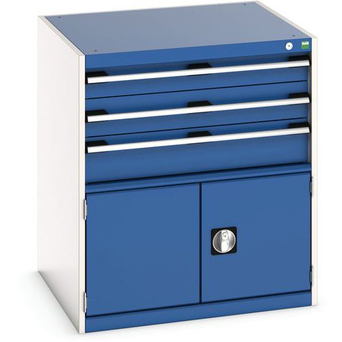 Dílenská zásuvková skříň Bott Cubio, 90 x 80 x 75 cm, 3 zásuvky, 1 skříňka, šedá-modrá