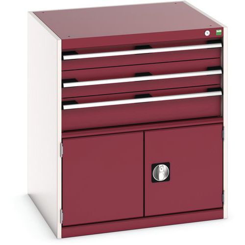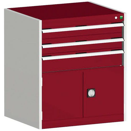 Dílenská zásuvková skříň Bott Cubio, 90 x 80 x 75 cm, 3 zásuvky, 1 skříňka, šedá-červená