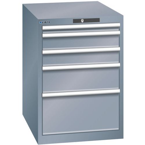 Dílenská zásuvková skříň LISTA, 5 zásuvek = 1x 50 + 2x 100 + 1x 200 + 1x 300mm, 564x725x850mm, tmavě šedá