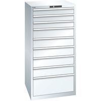 Dílenská zásuvková skříň LISTA, 9 zásuvek = 3 x 100 / 5 x 150 / 1 x 300mm, 717x725x1450mm, nosnost 200kg, bílá