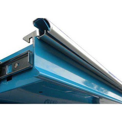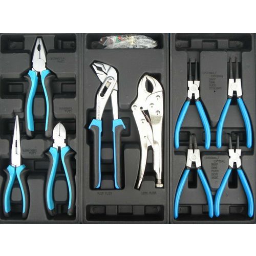- Čtvrtá zásuvka o rozměrech 53 cm x 5,5 cm x 45 cm obsahuje 9 ks kleští - kombinované, přímé, ohnuté, siko, kleště na pojistné kroužky.