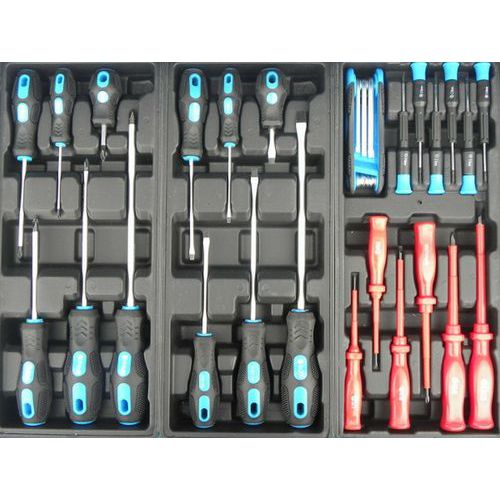 - Třetí zásuvka o rozměrech 53 cm x 5,5 cm x 45 cm obsahuje šroubováky elektrikářské, šroubováky precizní, TORX 5-6-7-8-9-10-15 a 6 Imbus klíčů.