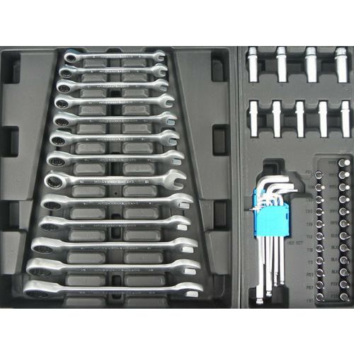 - Druhá zásuvka o rozměrech 53 cm x 5,5 cm x 45 cm obsahuje sadu očkoplochých klíčů s ráčnou, sadu imbusů a sadu hlavic.