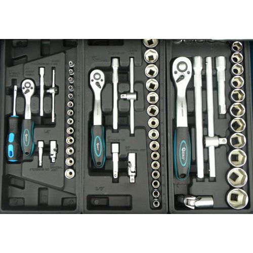 - První zásuvka o rozměrech 53 cm x 5,5 cm x 45 cm obsahuje set ráčen, hlavice a příslušenství 1/4, 3,8 a 1/2.