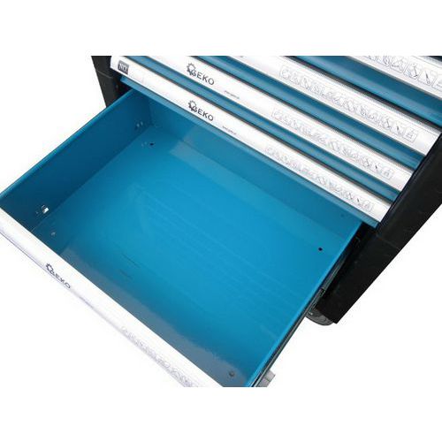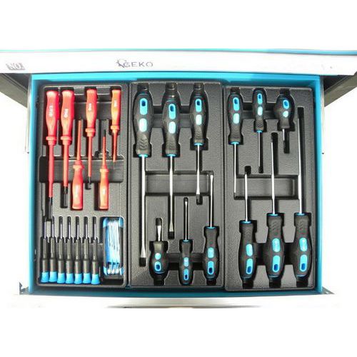 Třetí zásuvka o rozměrech 53 cm x 5,5 cm x 45 cm obsahuje 6 ks šroubováky elektrikářské, 6 ks šroubováky precizní, TORX 5-6-7-8-9-10-11, 7 Imbus klíčů.