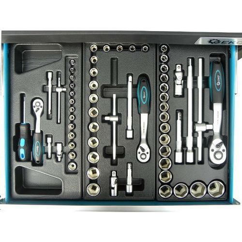 První zásuvka o rozměrech 53 cm x 5,5 cm x 45 cm obsahuje set ráčen, hlavice a příslušenství.