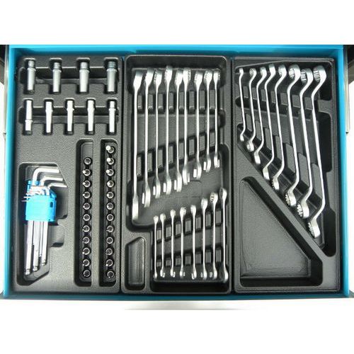 Druhá zásuvka o rozměrech 53 cm x 5,5 cm x 45 cm obsahuje 17 ks ploché klíče 6-22mm, 8 ks klíčů ohnuté 6-22mm, 32 bitů