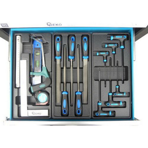 Čtvrtá zásuvka o rozměrech 53 cm x 5,5 cm x 45 cm obsahuje vodováhu, úhelník, svinovací metr, skládací metr, 5 ks pilníků a
